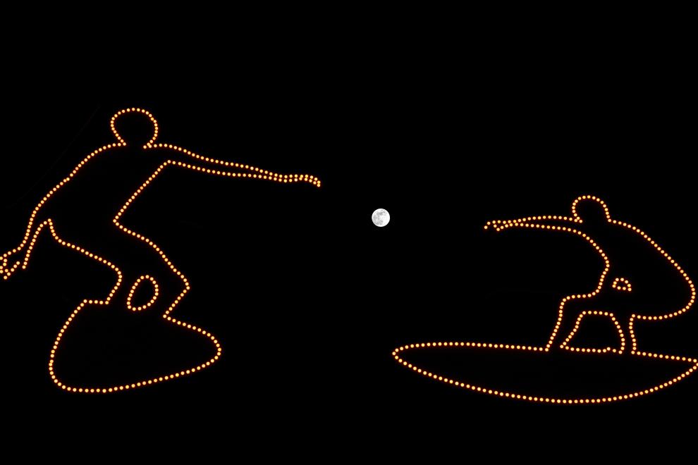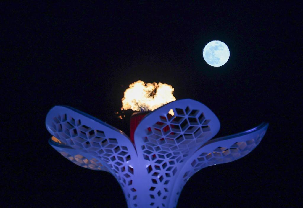↑在哈爾濱冰雪大世界拍攝的圓月和亞冬會(huì)主火炬。新華社記者 黃偉 攝