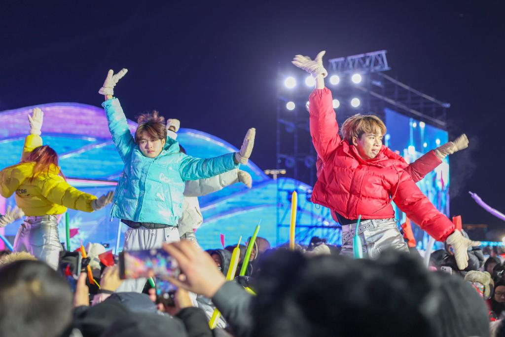 ↑演員在哈爾濱冰雪大世界舉行的“激情慶亞冬 冰雪鬧元宵”晚會(huì)上表演。新華社記者 黃偉 攝