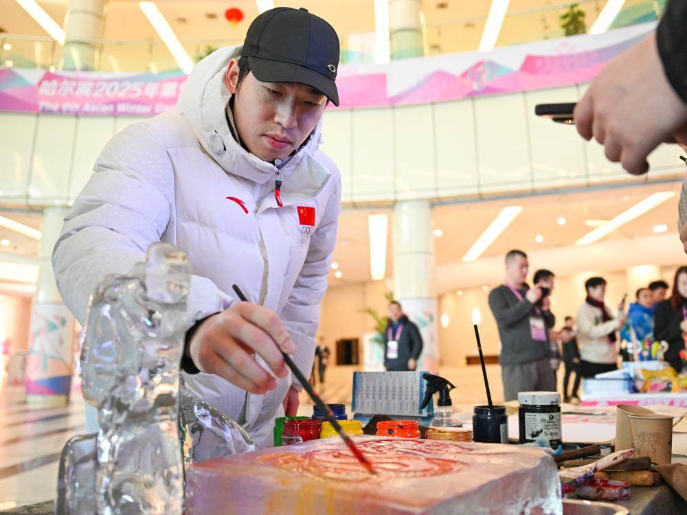 ↑在第九屆亞冬會(huì)運(yùn)動(dòng)員村,中國(guó)代表團(tuán)的冰球運(yùn)動(dòng)員張澤森在體驗(yàn)拓彩冰雪畫。新華社記者 王曦 攝