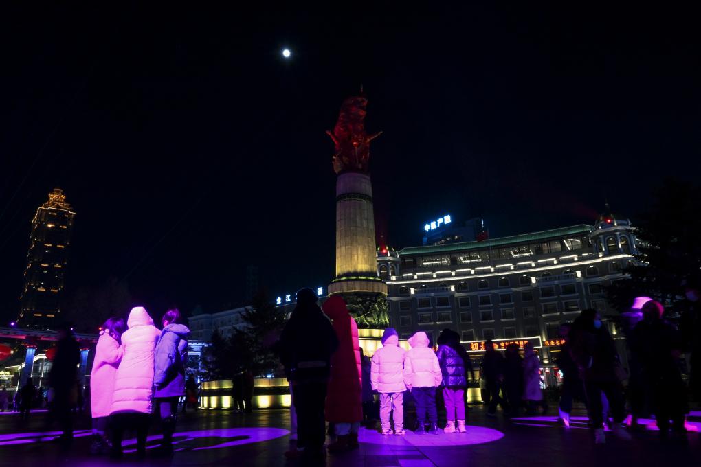 ↑在哈爾濱中央大街步行街拍攝的月亮。新華社記者 王曦 攝