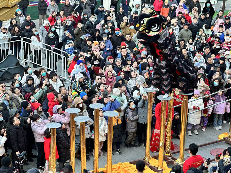 2月2日,在北京東岳廟廟會,門前的北獅表演吸引眾多市民游客駐足觀看。一位家住附近的游客對記者表示:“過年期間這里的舞獅表演每天都不一樣,南獅北獅都有??吹谜孢^癮!”