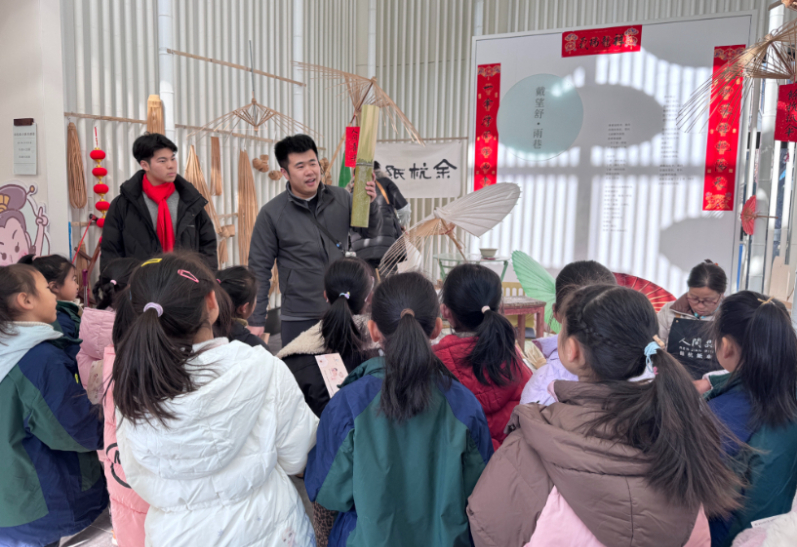 余杭紙傘非遺工坊主理人劉偉學向孩子們介紹傘骨的制作方法。(受訪者供圖)