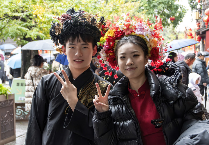2月3日,在福州市千年古街三坊七巷,兩名來自上海的游客頭戴“簪花”打卡留影。新華社記者魏培全攝