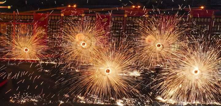 1月29日,民間藝人在河北省唐山市豐南區(qū)河頭老街景區(qū)表演打鐵花(無人機照片)。新華社發(fā)(劉滿倉攝)