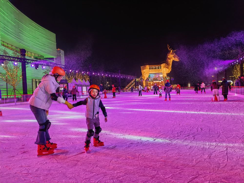 在上海徐匯濱江,“樂滑之夢”和西岸夢中心聯(lián)手打造的戶外水岸冰場熱鬧非凡。伴隨節(jié)奏感強(qiáng)的音樂和靈動燈光,上海市民周雄和兒子手牽手,在冰面上練習(xí)滑行。