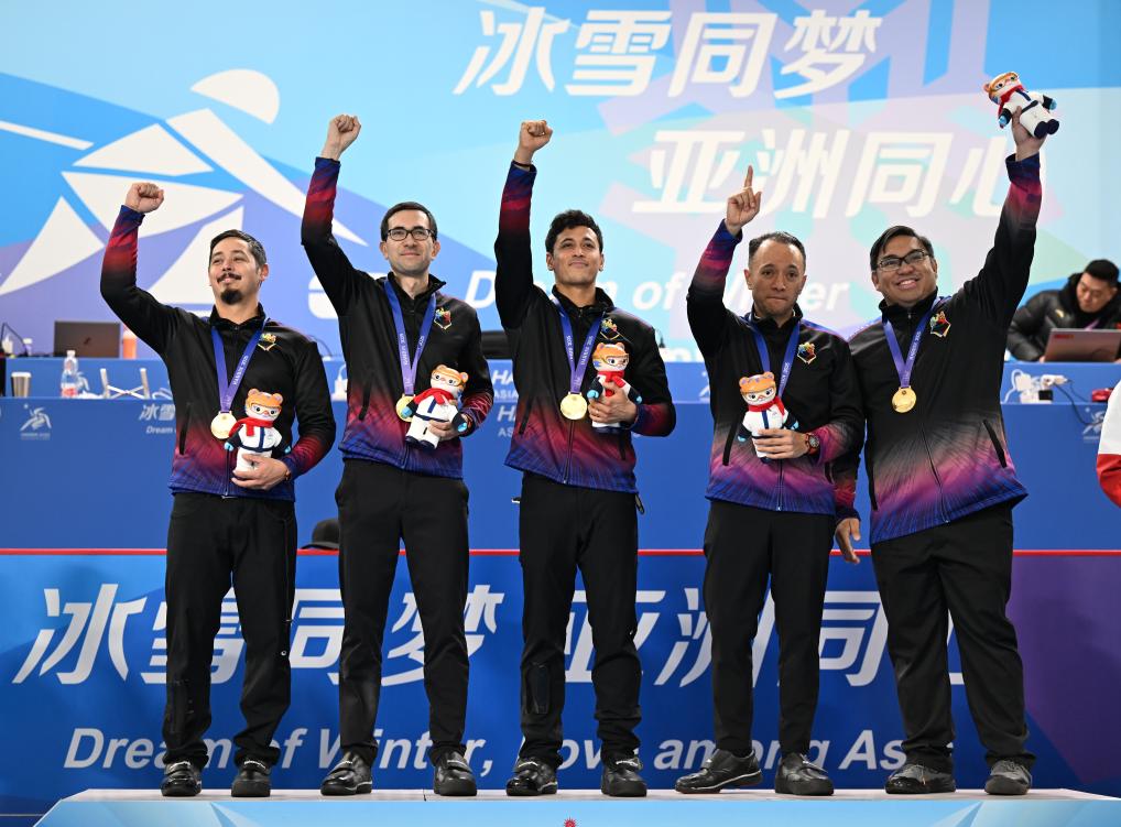 2月14日,第九屆亞冬會男子冰壺頒獎儀式在哈爾濱舉行。菲律賓隊(duì)獲得冠軍。新華社記者 趙子碩 攝