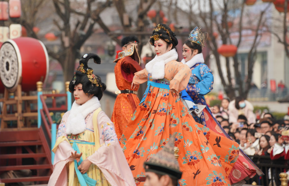 1月31日,游客在陜西西安大唐不夜城景區(qū)觀看以唐代歷史文化為背景創(chuàng)作的舞劇。新華社記者 邵瑞 攝