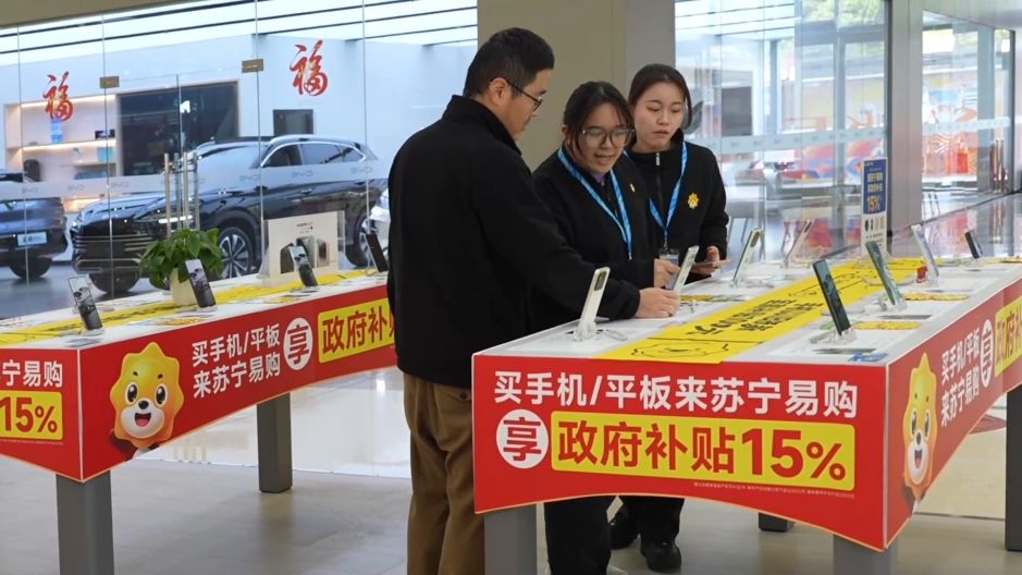 “以舊換新咨詢的比較多的是手機(jī)這一塊。因?yàn)槭謾C(jī)、平板和智能手環(huán)這一塊是新增的補(bǔ)貼?!碧K寧易購(gòu)廣西三祺廣場(chǎng)店店長(zhǎng) 廖永寧表示。