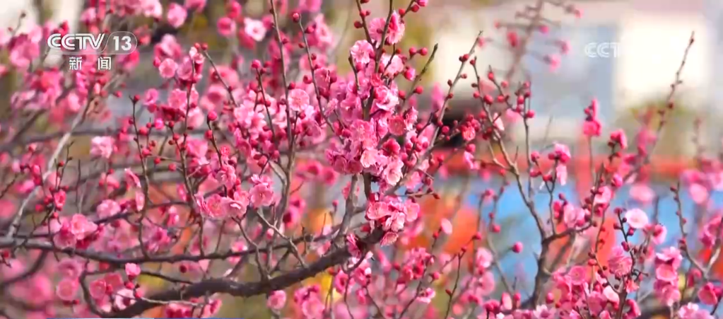 同樣,在甘肅隴南市武都區(qū),濕地公園內(nèi)的梅花也競相綻放,粉紅相間的花朵掛滿枝頭,幽香彌漫在空氣中,引來蜜蜂翩翩起舞。