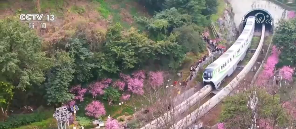 二月下旬,重慶渝中區(qū)佛圖關(guān)公園的美人梅逐漸進(jìn)入盛放期,粉色花海間,列車穿行而過,繪就了一幅爛漫的春景圖。這趟“開往春天的列車”吸引了很多市民前來打卡拍照,記錄春日美好時光。
