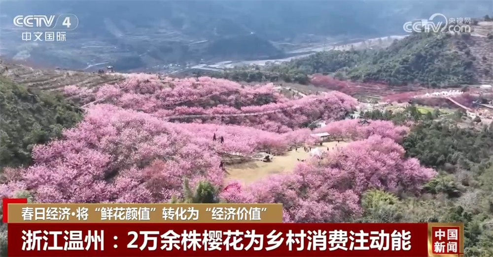 浙江省永嘉縣的溫州櫻花園占地3600畝,已開(kāi)發(fā)利用1700多畝,種植了2萬(wàn)余株櫻花,品種涵蓋臺(tái)灣牡丹櫻、紅粉佳人櫻等數(shù)十個(gè)品種。盛開(kāi)的櫻花吸引了游客,也帶動(dòng)了當(dāng)?shù)夭惋嫛⒆∷?、旅游、交通等服?wù)消費(fèi)快速增長(zhǎng),自2月13日開(kāi)園以來(lái),櫻花園日均接待游客近3000人次,周末更是突破1萬(wàn)多人。