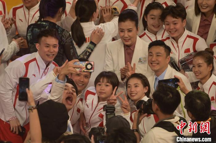 2024年8月30日,訪港的中國內(nèi)地奧運(yùn)健兒出席奧運(yùn)健兒大匯演。圖為香港藝人與奧運(yùn)健兒自拍?!≈行律缬浾?陳永諾 攝