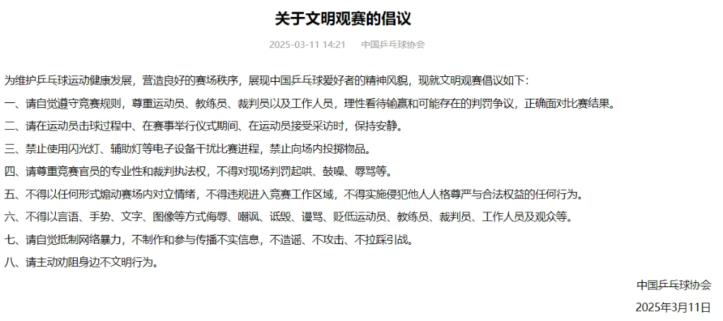 中國乒乓球協(xié)會11日在官網(wǎng)發(fā)布《關于文明觀賽的倡議》,其中提到理性看待輸贏、抵制網(wǎng)絡暴力等八項內(nèi)容。