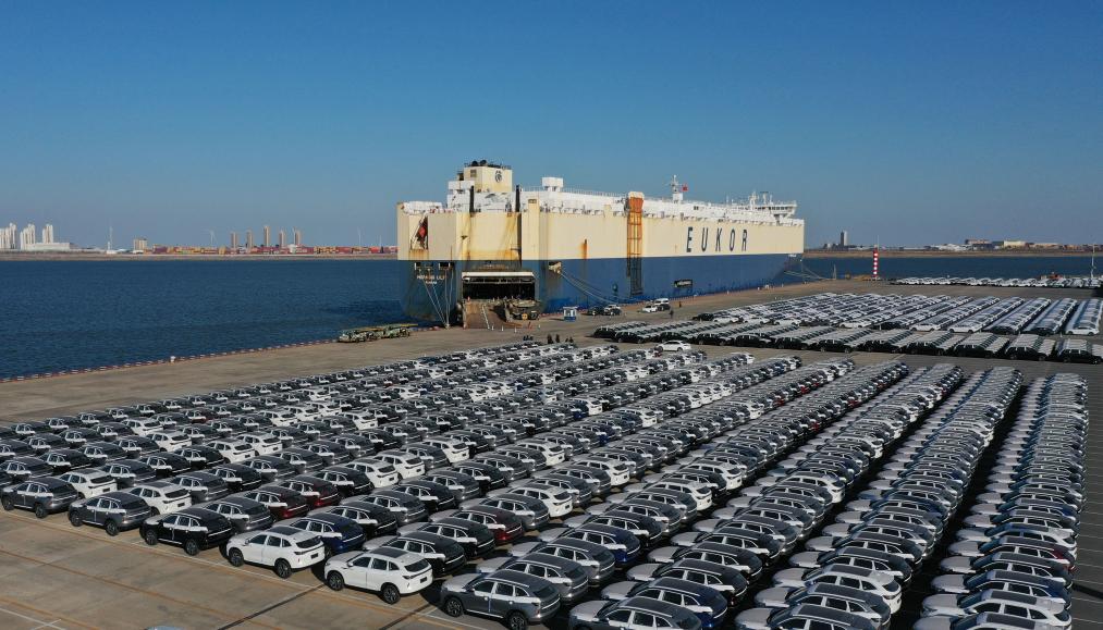 2025年2月25日,來(lái)自京津冀地區(qū)的超4000輛國(guó)產(chǎn)自主品牌汽車(chē)在天津港環(huán)球滾裝碼頭等待裝船發(fā)往海外(無(wú)人機(jī)照片)。新華社記者 趙子碩 攝