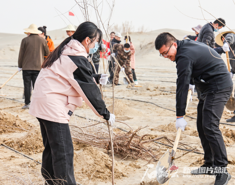 3月12日,在和田市現(xiàn)代農(nóng)業(yè)產(chǎn)業(yè)園區(qū)植樹點(diǎn),干部職工相互配合植樹。許曉龍攝