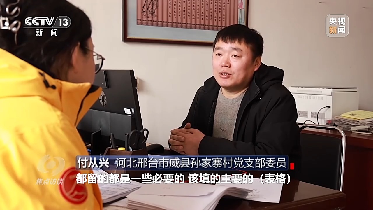 河北邢臺市威縣孫家寨村黨支部委員 付從興:現(xiàn)在各個部門表格減少了,都留的都是一些必要的、該填的主要的表格,我感覺這樣很好,很精簡,入戶有更多精力去給人家探索這些事情,人家家里確實發(fā)生什么困難,有多少收入,咱們的政策怎么能幫助人家。