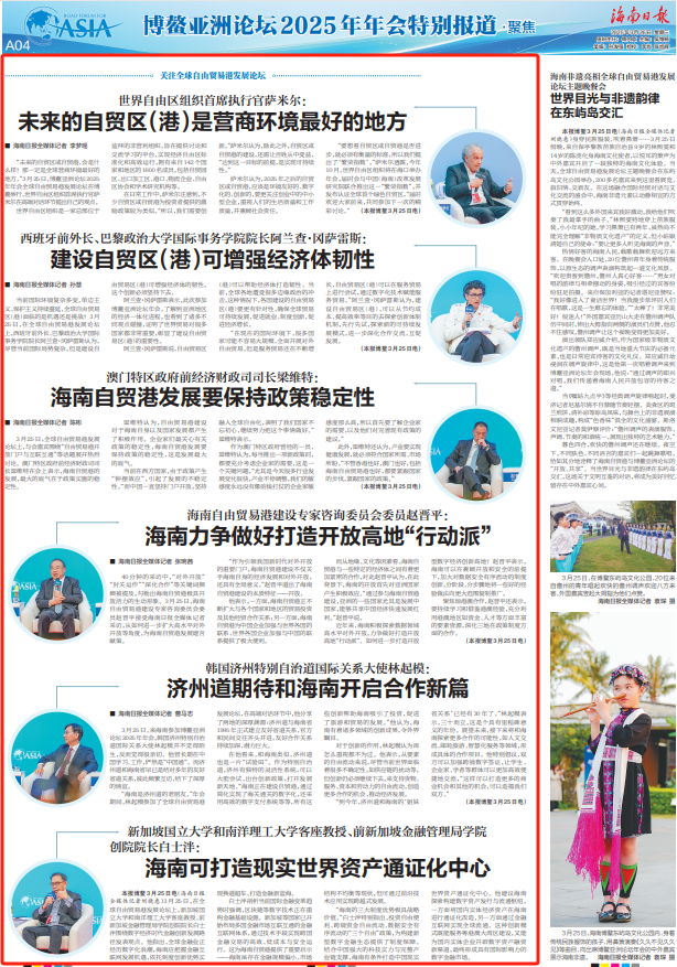 2025年是海南自貿(mào)港封關(guān)運作、擴大開放之年。當天,與會嘉賓圍繞“自由貿(mào)易港賦能全球經(jīng)貿(mào)合作”“自由貿(mào)易港引領(lǐng)全球自由貿(mào)易進程”“自由貿(mào)易港開放門戶與互聯(lián)互通”等議題進行深入交流探討,共同描繪自貿(mào)港發(fā)展新藍圖,為海南自貿(mào)港建設(shè)貢獻“博鰲智慧”。