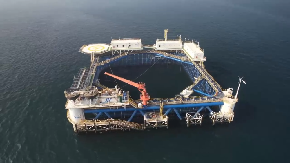在距離大陸岸線42海里的海域坐落著這樣的深遠(yuǎn)海智能網(wǎng)箱平臺(tái),網(wǎng)箱長(zhǎng)寬均為68米,布設(shè)500個(gè)監(jiān)測(cè)點(diǎn),配備了聲納、激光雷達(dá)等設(shè)備。這樣的1個(gè)網(wǎng)箱每年能產(chǎn)出100萬條魚,只需要4個(gè)工人來操作。