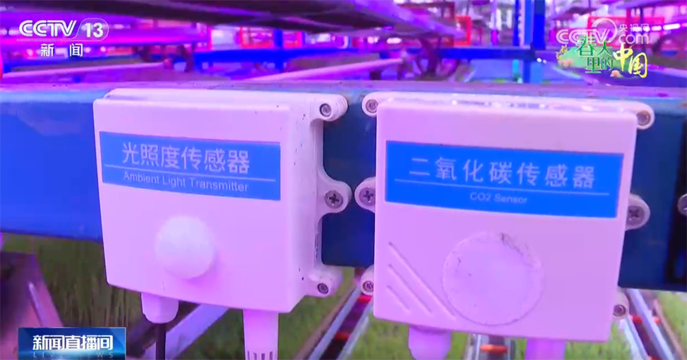 來到這個育秧車間,我們可以看到現在的秧苗都已經坐上電梯了。在立體循環(huán)育秧架上,一盤盤綠油油的秧苗坐著升降梯輪流接受光照。架子上還裝有智能傳感器,把溫度、濕度等信息實時顯示在大屏上。同時,還可以用手機進行遠程操控,根據秧苗長勢自動進行補光、噴淋。