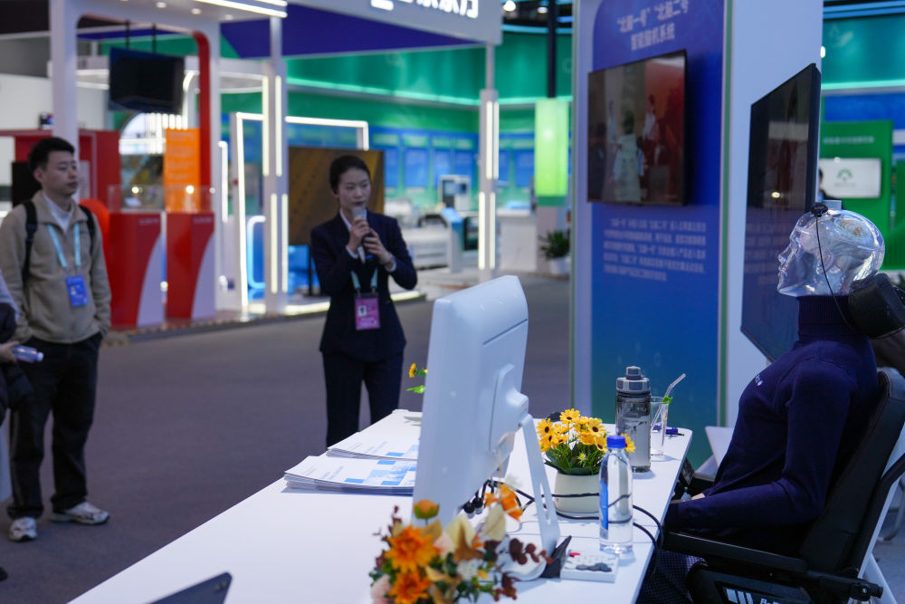 在中關(guān)村展示中心常設展內(nèi),參觀者在聽取“北腦一號”“北腦二號”智能腦機系統(tǒng)介紹。新華社記者 鞠煥宗 攝