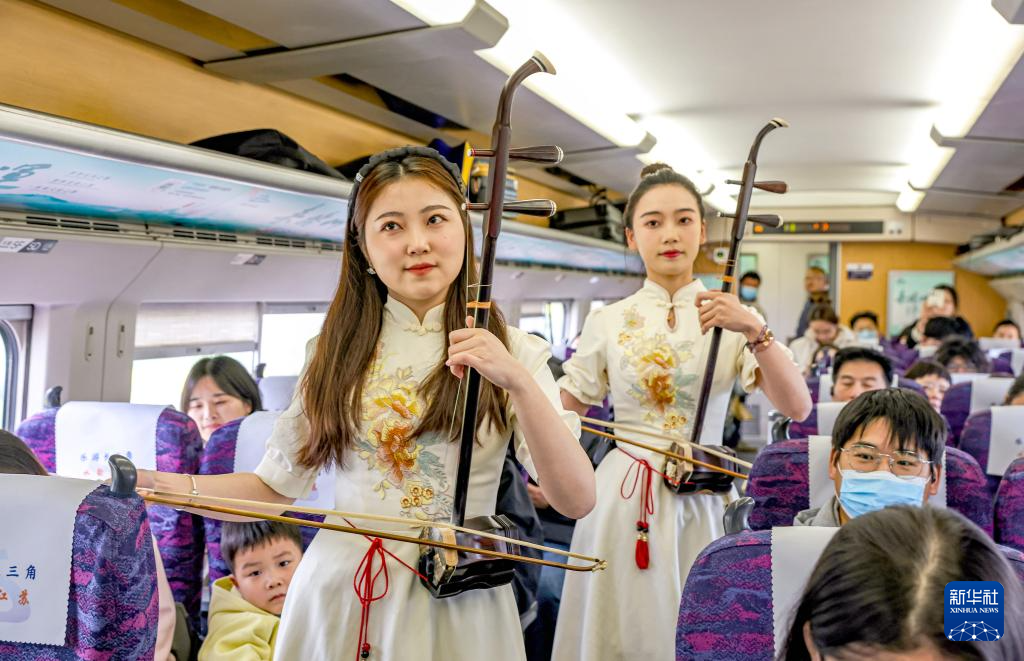 3月29日,揚州市文藝工作者在“水韻江蘇”主題旅游列車上進(jìn)行二胡演奏。