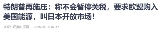 一覺(jué)醒來(lái),特朗普再發(fā)威脅,警告中國(guó)在4月8號(hào)前取消報(bào)復(fù),不然4月9號(hào)就對(duì)中國(guó)再加50%額外關(guān)稅,此外所有和中國(guó)的談判都會(huì)中止,而和其他國(guó)家的談判將立即開(kāi)始。