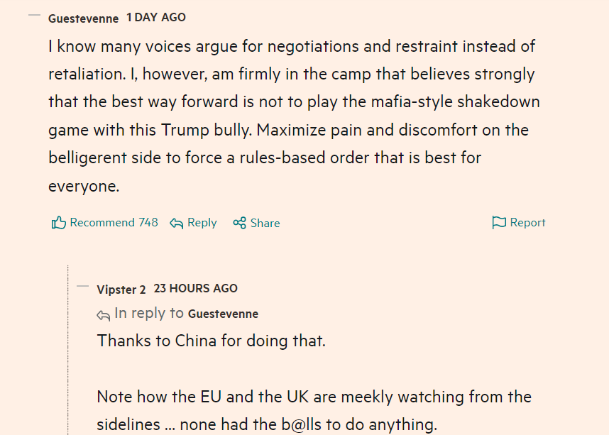 中國的嚴正立場也引發(fā)了同樣受到美國關稅影響的各國網(wǎng)民對中國的廣泛支持。在英國《金融時報》相關報道評論區(qū),獲贊最多的一條網(wǎng)友評論稱:“我知道有許多聲音主張通過談判和克制來解決問題,而不是采取反制行動。然而,我強烈認為最好的前進方式就是將好戰(zhàn)一方的痛苦和不適最大化,如此才能建立一個對所有人都有利的基于規(guī)則的秩序?!?/p>