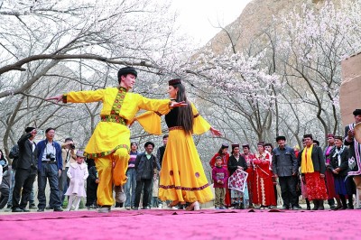 新疆阿克陶縣塔爾鄉(xiāng)民間藝人與游客在杏花樹下共舞。毛吾拉江·艾山江攝