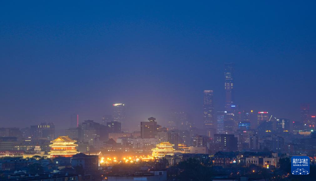 北京日落后的正陽門城樓、箭樓和遠(yuǎn)處的CBD建筑群(4月14日攝)。新華社記者 陳曄華 攝