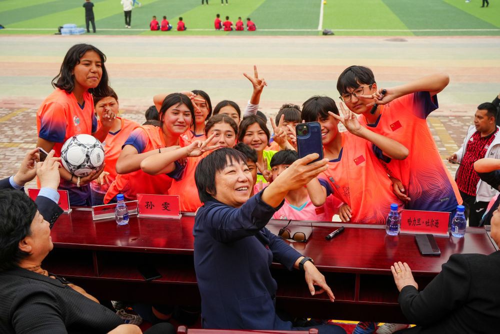 ↑4月12日,在2025新疆克孜勒蘇柯爾克孜自治州足球聯(lián)賽開幕式后,中國足協(xié)副主席、前中國國家女子足球隊(duì)球員孫雯(前)與阿圖什市U13女子足球隊(duì)合影。新華社記者 徐宏巖 攝