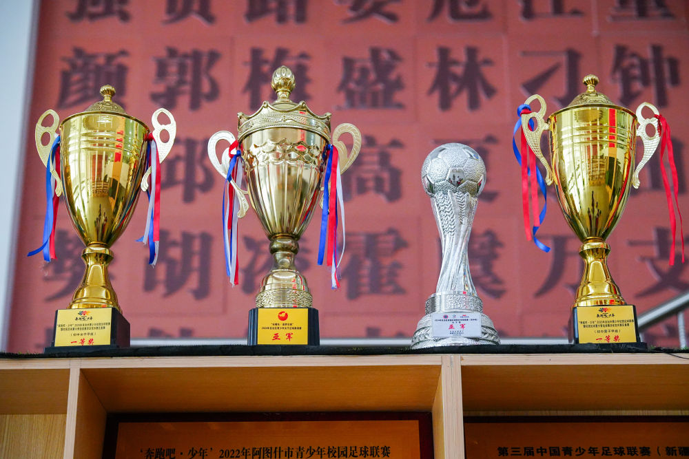↑這是4月14日在新疆克孜勒蘇柯爾克孜自治州阿圖什市硝魯克中學(xué)拍攝的獎(jiǎng)杯。新華社記者 徐宏巖 攝