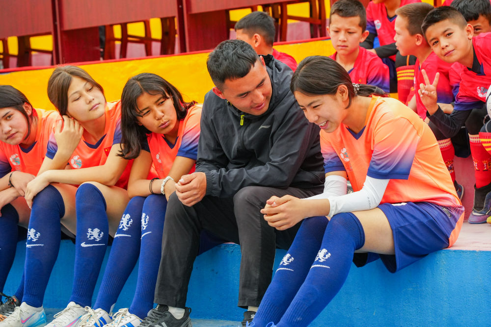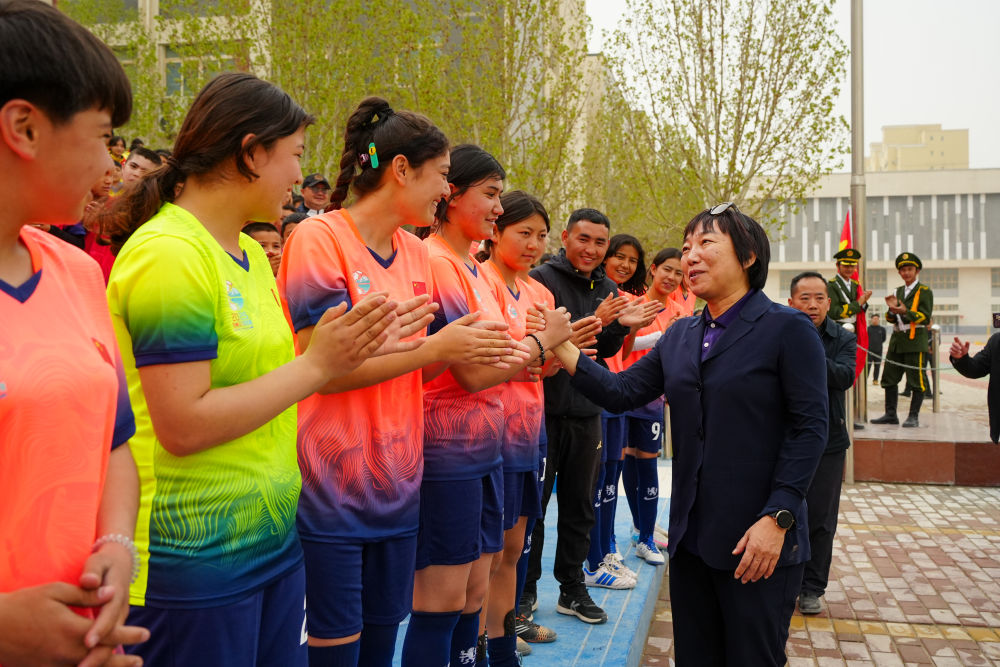↑4月12日,2025新疆克孜勒蘇柯爾克孜自治州足球聯(lián)賽開幕式后,中國足協(xié)副主席、前中國國家女子足球隊(duì)球員孫雯(前右一)與阿圖什市U13女子足球隊(duì)隊(duì)員阿依謝·托乎達(dá)洪(左三)交流。新華社記者 徐宏巖 攝