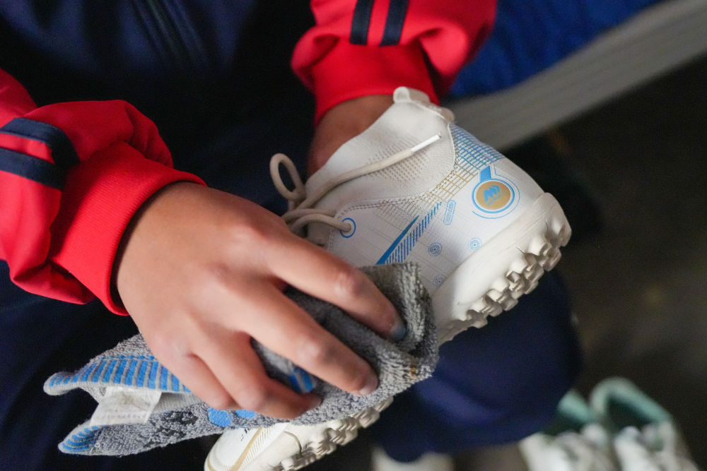 ↑4月10日,在阿圖什市硝魯克中學(xué)宿舍,一名球隊(duì)球員在擦拭自己心愛的球鞋。球員們的裝備由學(xué)校免費(fèi)發(fā)放。新華社記者 徐宏巖 攝