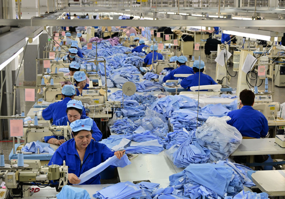 3月25日,山東青島即墨區(qū)即發(fā)工業(yè)園內(nèi)一家服裝企業(yè)的職工在使用智能縫紉機進行生產(chǎn)。新華社記者 李紫恒 攝