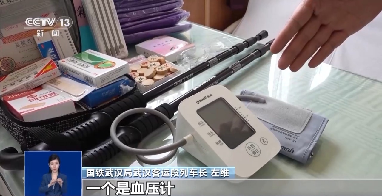 國鐵武漢局武漢客運(yùn)段列車長 左維:我們列車提供了以下這些物品:血壓計、老年人經(jīng)常使用基礎(chǔ)藥包,在車廂里面還設(shè)置了無障礙廁所,早上還提供軟食,老年旅客更容易消化吸收。