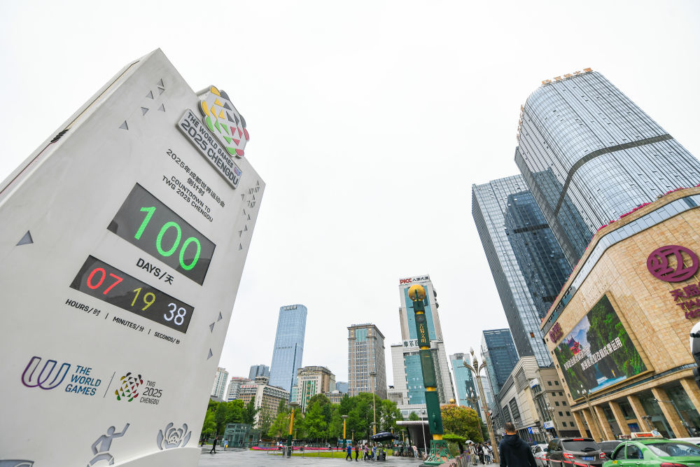 4月29日在成都天府廣場(chǎng)拍攝的成都世運(yùn)會(huì)倒計(jì)時(shí)電子裝置。新華社記者 王曦 攝