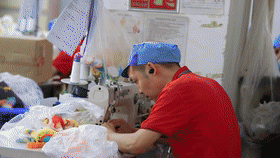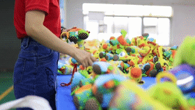 車間另一頭,品檢組組長(zhǎng)梁建敏正給玩具成品審核把關(guān)。梁建敏很瘦,但很有能量,拖貨、倒貨、檢查貨,好像總有使不完的力氣,臉上總是掛著陽(yáng)光般的笑容,眼睛里充滿對(duì)工作的熱忱。她驗(yàn)貨時(shí)不單用眼睛,還會(huì)把毛絨玩具貼近耳朵來(lái)聽。