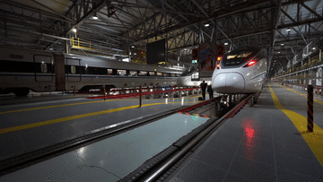 動(dòng)車進(jìn)入檢修庫(kù)內(nèi),工作人員正根據(jù)任務(wù)計(jì)劃進(jìn)行動(dòng)車組一級(jí)修作業(yè)。