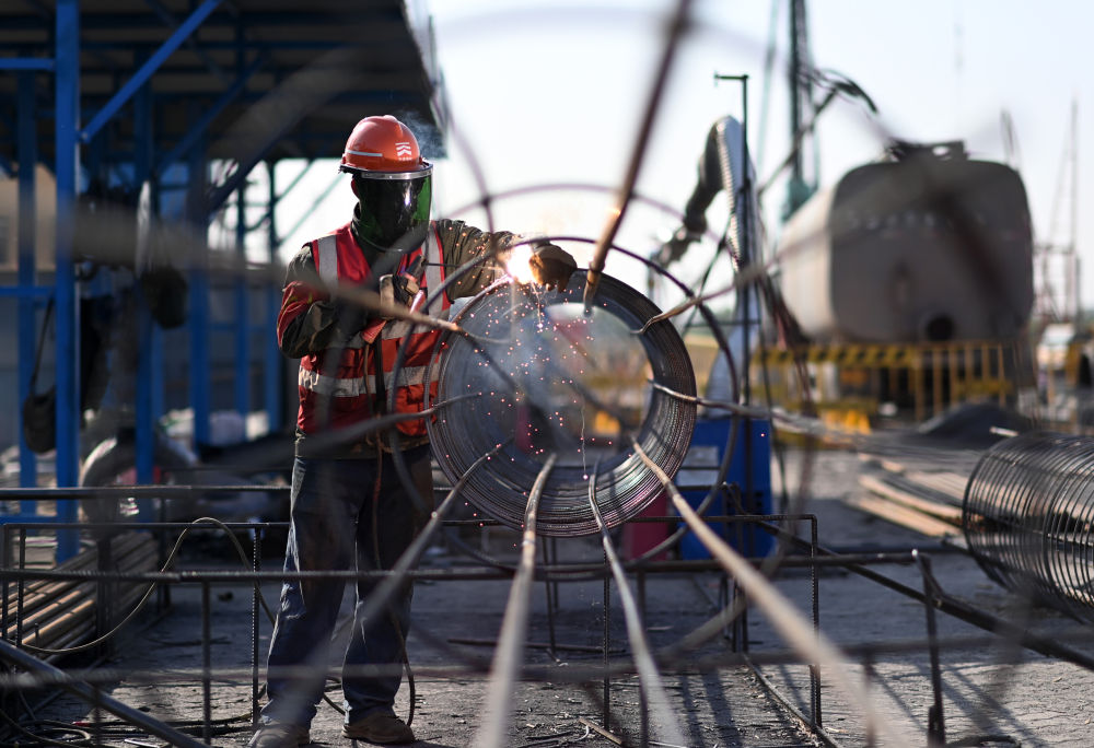 4月25日,工人在天津港第一港埠有限公司散糧三期新建筒倉(cāng)工程建設(shè)現(xiàn)場(chǎng)施工。新華社記者 趙子碩 攝
