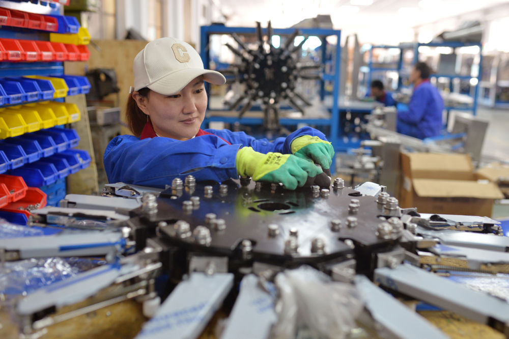 3月30日,在山東省青島市城陽(yáng)區(qū)夏莊街道青島義龍裝備制造股份有限公司生產(chǎn)車間內(nèi),工人在組裝包裝機(jī)。新華社發(fā)(王海濱攝)