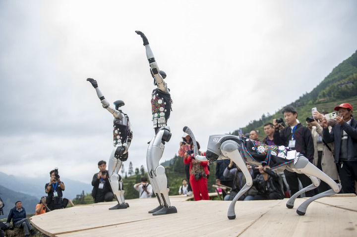2025年4月26日,機(jī)器人在貴州省從江縣加榜梯田上參加梯田走秀活動。