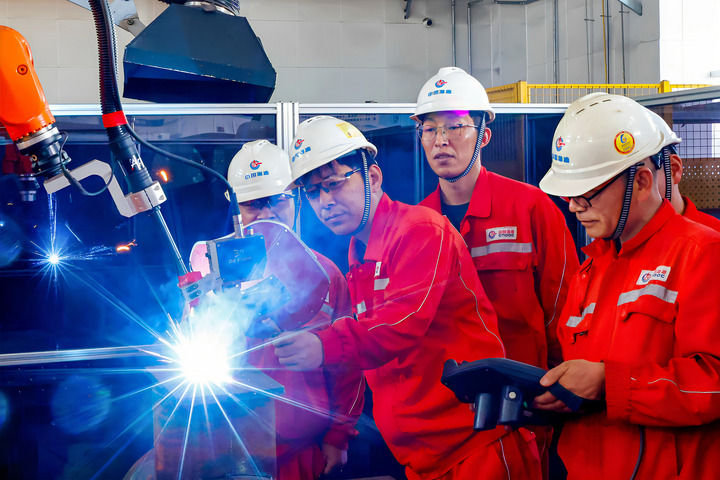 2025年4月29日,在海油工程天津智能化制造基地,劉海林(左二)和同事調(diào)試一臺焊接機(jī)器人。