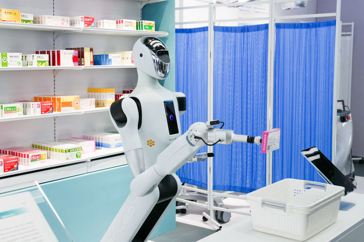 2025年2月24日,在北京“機(jī)器人大世界”的應(yīng)用場景示范區(qū),銀河通用機(jī)器人進(jìn)行藥店無人值守場景演示。