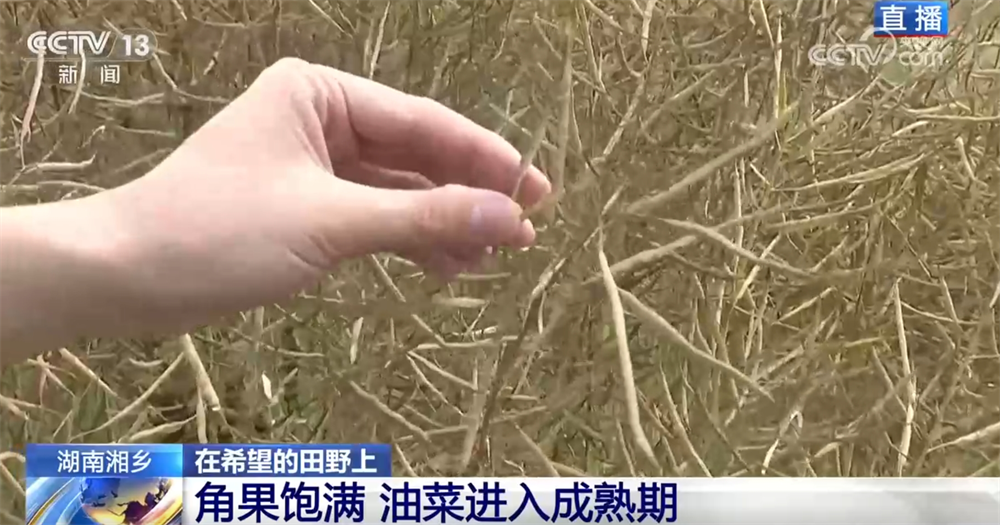 記者來(lái)到了湘潭湘鄉(xiāng)市泉塘鎮(zhèn)雙江村,油菜現(xiàn)在長(zhǎng)得怎么樣了?油菜的頂端已經(jīng)呈金黃色,角果很飽滿,我們平時(shí)常說(shuō)的油菜籽就藏在金黃色的角果里,這說(shuō)明現(xiàn)在油菜已經(jīng)進(jìn)入成熟期了。