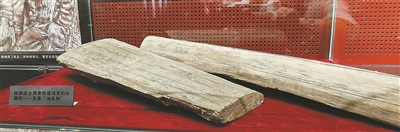 展柜中看似普通的兩塊木頭,實(shí)為文物“消息樹(shù)”。樹(shù)皮上,“中國(guó)報(bào)”等字跡仍能辨認(rèn)。