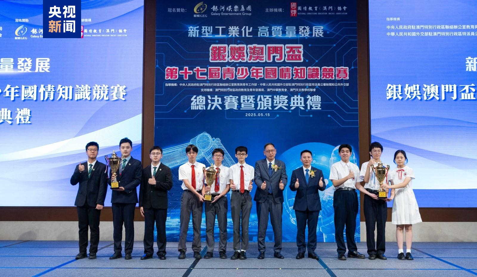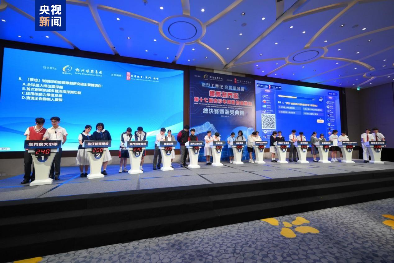 澳門第十七屆青少年國(guó)情知識(shí)競(jìng)賽總決賽暨頒獎(jiǎng)典禮15日舉行。本屆賽事共吸引了澳門26所中學(xué)和8所高等院校逾15000名學(xué)生踴躍參與,規(guī)模再創(chuàng)新高。培道中學(xué)、鏡平學(xué)校和澳門理工大學(xué)分別奪得兩個(gè)中學(xué)組和一個(gè)大學(xué)組冠軍。