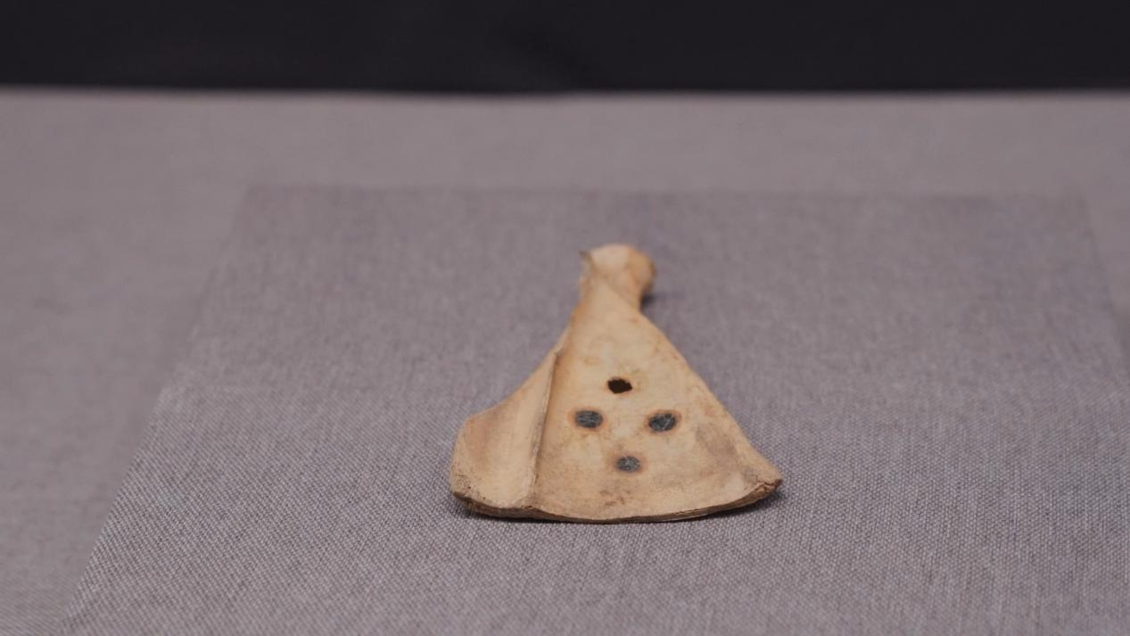 西域都護府博物館館長 唐羽嵐:卓爾庫特古城它出土的遺物,其中有一些非常的獨特,而且應該說是全疆也是唯一性的,其中有三枚就是保存得非常完整,品相非常好的卜骨。