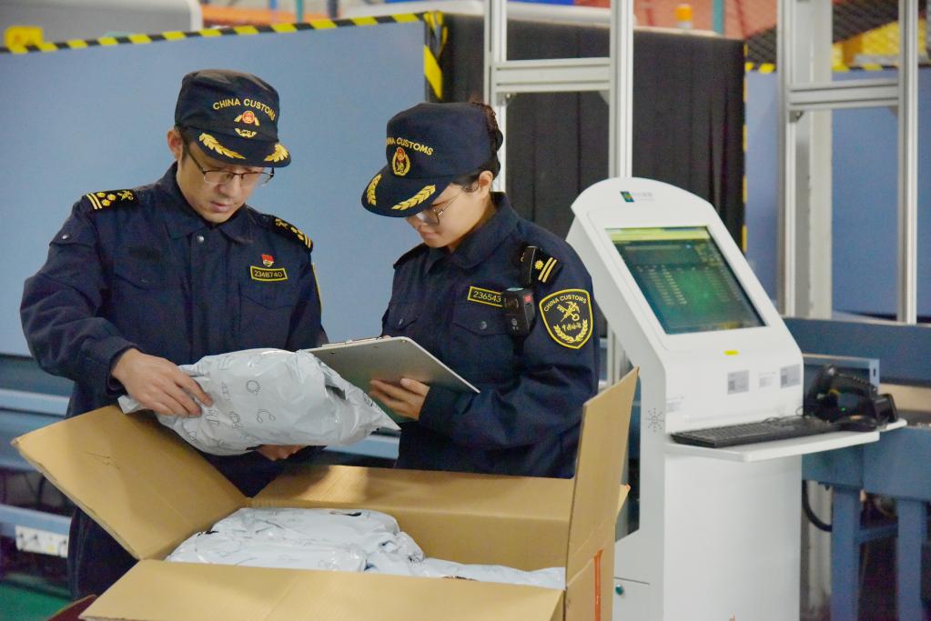 無錫海關(guān)關(guān)員對運(yùn)往墨西哥的跨境電商商品進(jìn)行查驗(2024年12月26日攝)。新華社發(fā)