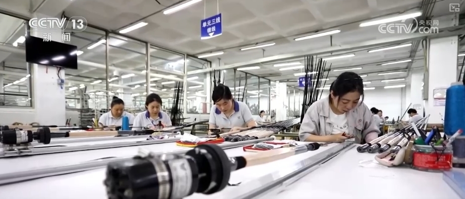 山東威海的釣具早已蜚聲海外,這里聚集了近5000家釣具生產(chǎn)及貿(mào)易企業(yè),包攬了全球六成魚竿市場份額。在這家規(guī)模較大的生產(chǎn)企業(yè)里,碳纖維魚竿從自動流水線魚貫而下,即將發(fā)往歐洲市場。2025年以來,企業(yè)出口額達(dá)2.1億元,同比增長27%。