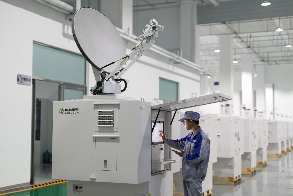 4月21日,工作人員在中科星云智造基地調(diào)試一款裝有衛(wèi)星天線(xiàn)的數(shù)據(jù)方艙產(chǎn)品。新華社記者 杜瀟逸 攝